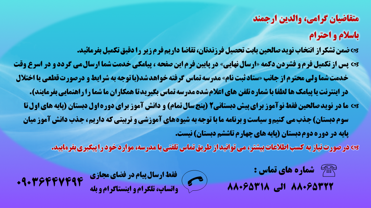 ثبت نام پیش دبستان و دبستان پیش ثبت نام نوید صالحین پیش دبستان و دبستان مدرسه منطقه 6 مدارس منطقه 6 نوید صالحین مجتمع آموزشی نوید صالحین پیش دبستان و دبستان مدرسه پایه اول پایه دوم پایه سوم پایه چهارم پایه پنجم پایه ششم ابتدایی