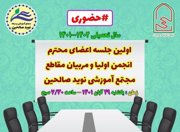 اولین جلسه مشترک انجمن اولیا و مربیان مقاطع مجتمع آموزشی نوید صالحین( دبستان ، دبیرستان دوره اول و دوم )با حضور مدیرعامل موسسه ، معاون آموزشی و فرهنگی مجتمع ، اعضای هیات رئیسه انجمن مقاطع و مدیران مقاطع در روز یکشنیه 29 آبانماه 1401 در موسسه نوید صالحین برگزار گردید .