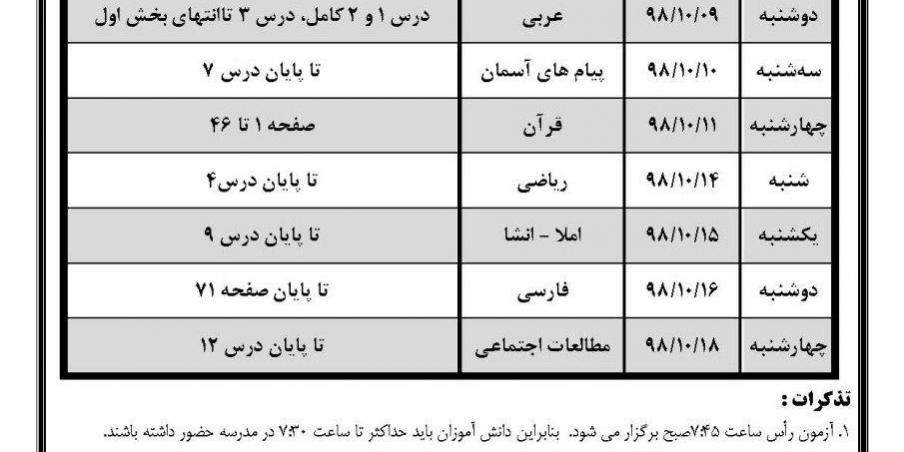 دسامبر262019پایه هفتم با توجه به تعطیلات مدرسه در روز های گذشته برنامه ی امتحانی جدید به پیوست جهت اقدامات لازم قرار داده شده است. Category: پایه هفتمBy administrator2019/12/26Leave a comment Author: administrator Post navigationPreviousPrevious post:کاربرگ تابستانی ریاضی – پایه نهمNextNext post:برنامه و بودجه بندی جدید آزمون های ترم اول پایه هشتمRelated Postsکاربرگ تابستانی ریاضی – پایه هفتم2019/08/19کاربرگ تابستانی علوم – پایه هفتم2019/08/19نکات مهم ویژه همسفران اردوي يزد2019/01/03